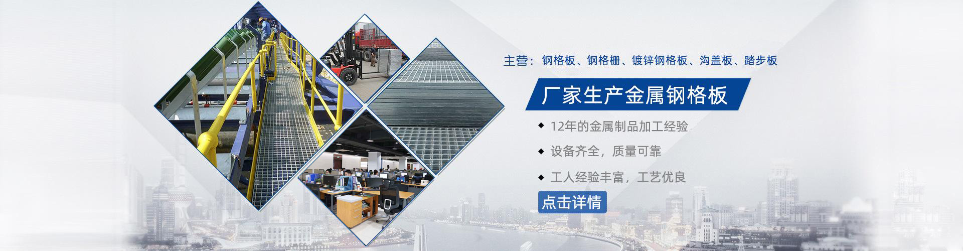 公司采用大型數控鋼格板機生產各種規格的:鍍鋅鋼格板、鋼格柵板、不銹鋼格柵板、防滑鋼格板、插接鋼格板、溝蓋板、井蓋板、樓梯踏步板、鋼格板圍欄、鋼格柵板吊頂復合鋼格板、穿孔鋼格板、鋼梯及鋼格板安裝夾等多個系列,近百種規格。產品適用于化工、港口、電力、造紙、鋼鐵、市政、石油、污水處理等各個領域。